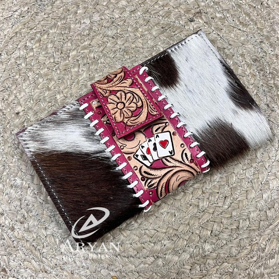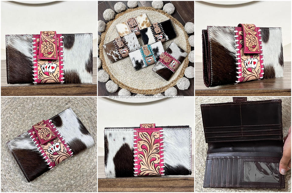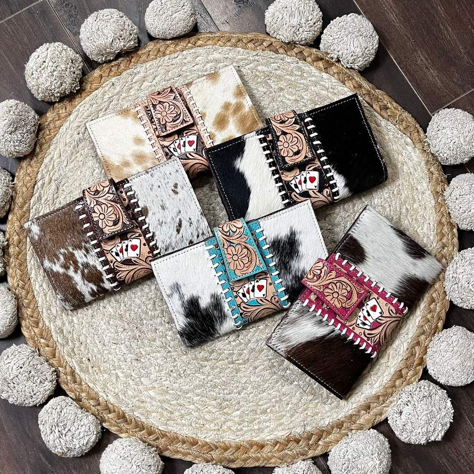 Portefeuilles en cuir de vachette façonnés à la main 2026, motif floral western, porte-cartes en cuir de vache à poils, portefeuille pour femme fait main, pochettes western pour femme
