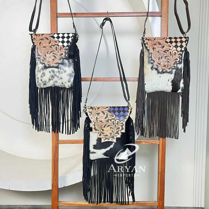 Sac bandoulière à carreaux avec franges en cuir travaillé à la main
