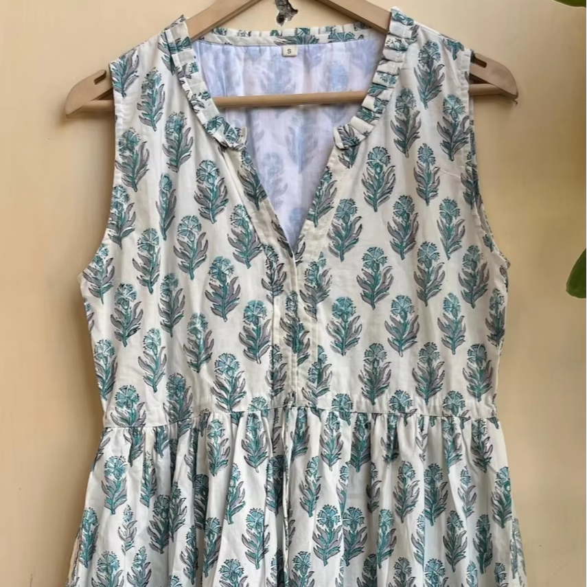Robe longue sans manches imprimée au bloc artisanal, style vintage floral en coton indien brodé, pour femme, collection été 2026, best-seller