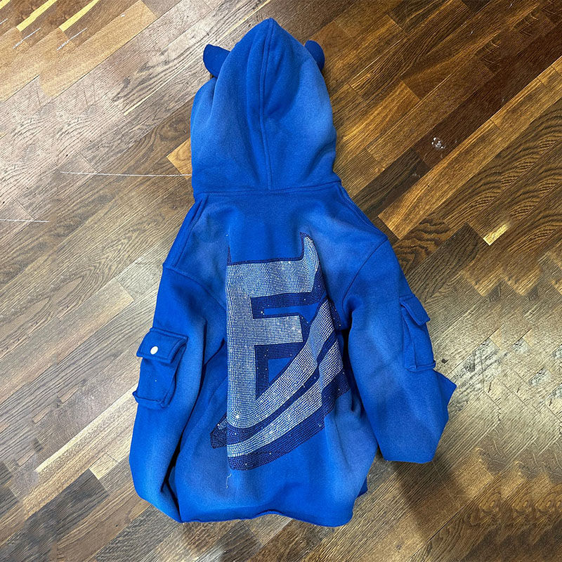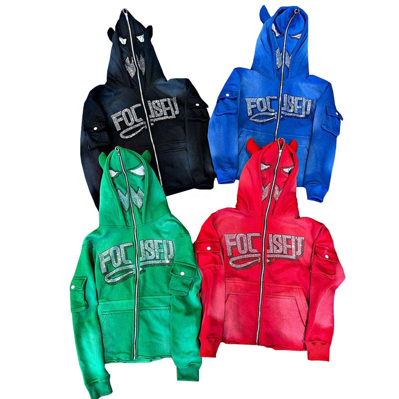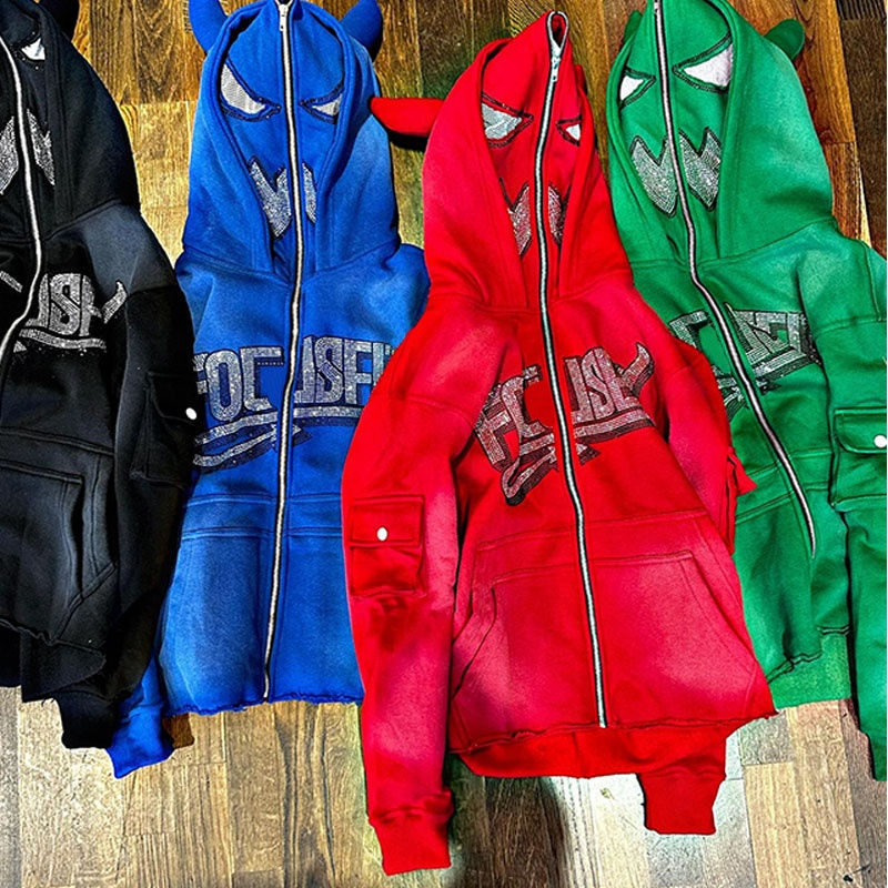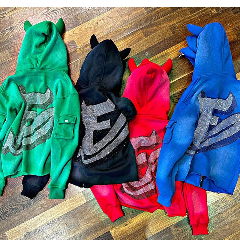 Sweat à capuche zippé pour homme 2026, orné de strass, poids lourd | Veste d'hiver à motif lettres | Collier en strass Streetwear OEM