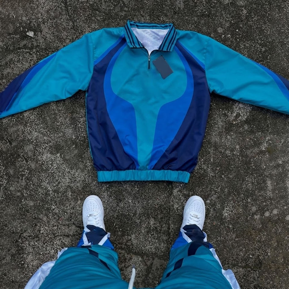 Ensemble de survêtement décontracté deux pièces pour homme en tissu mémoire de polyester tissé, coupe-vent et pantalon, avec logo personnalisé, collection automne 2026