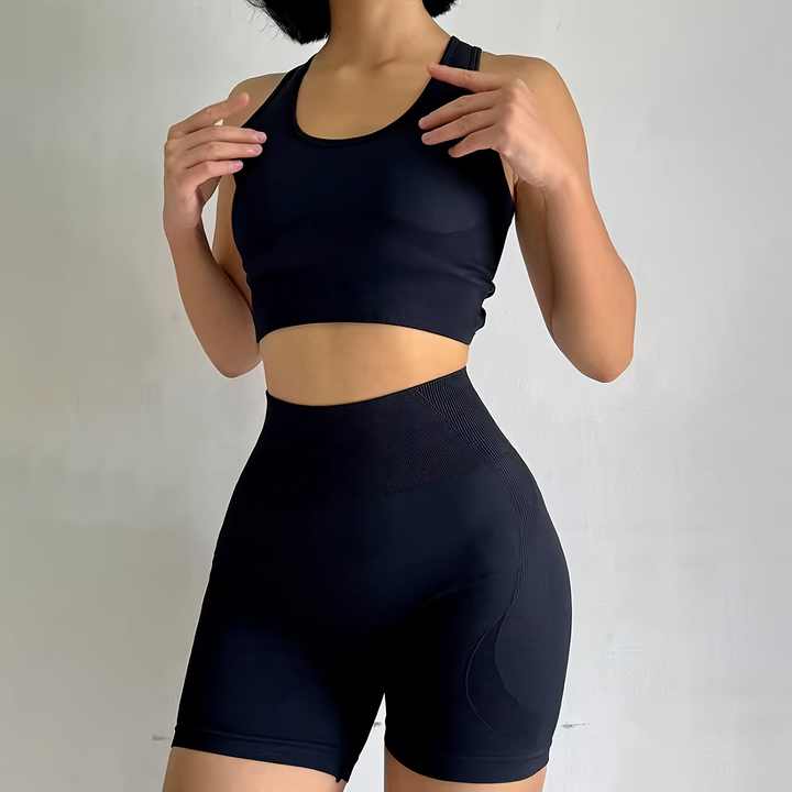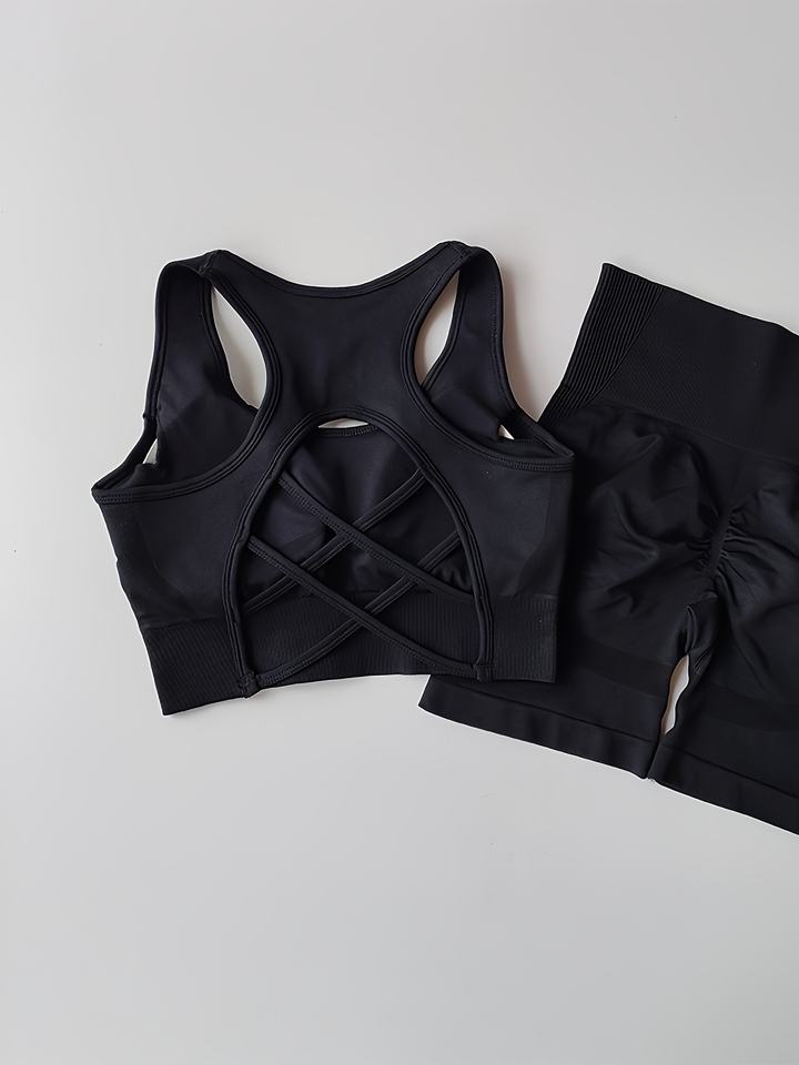 Nouvel Arrivage 2026 Ensemble Sportif Femme : Crop Top Côtelé Bleu Dos Nageur et Short Cycliste Taille Haute Froncé pour Gym, Yoga et Sport