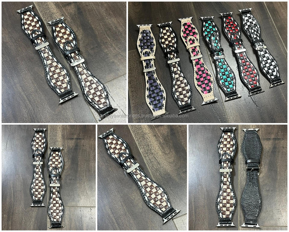 Bracelet de montre intelligente en cuir à carreaux travaillé à la main