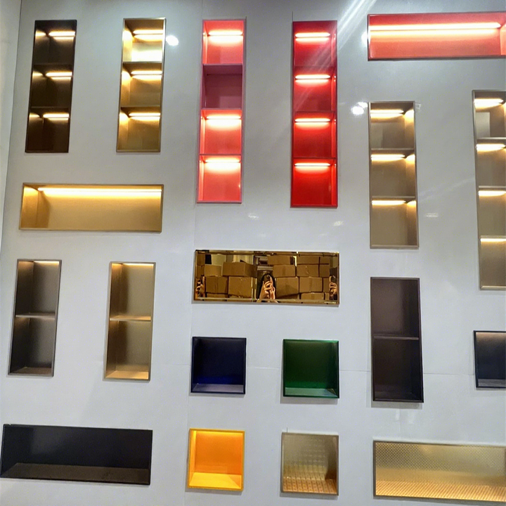Nouvelle conception 2026, étagère de niche de douche en acier inoxydable noir, or, bleu, vert, personnalisée, avec éclairage LED