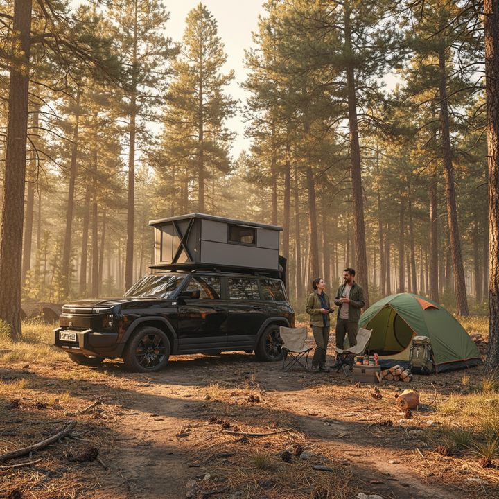 Nouvelle conception 2026, tente de toit portable facile à installer pour 2 à 4 personnes, avec poteaux en aluminium, système de levage électrique pour toit de voiture et support.