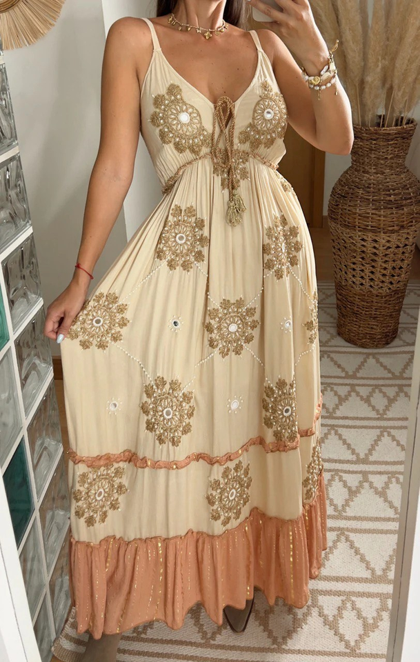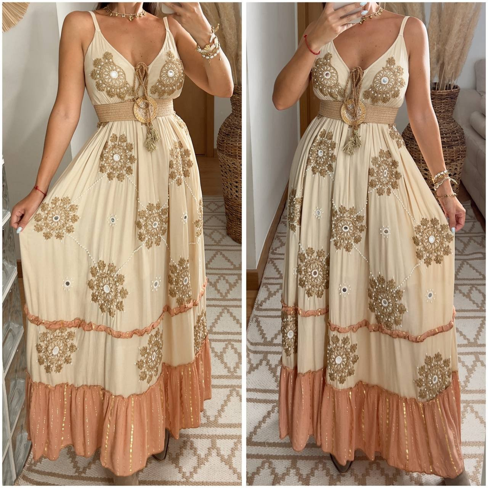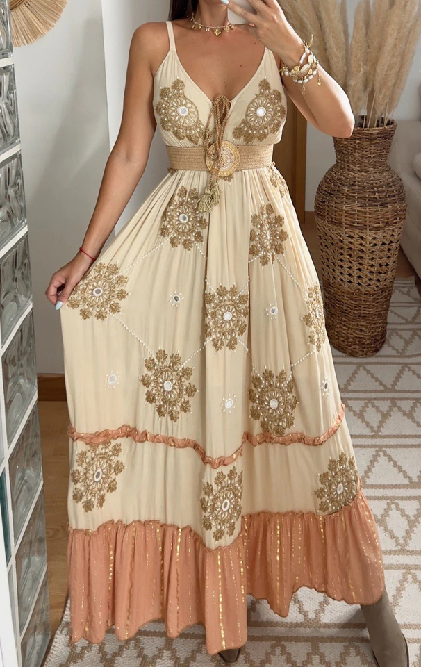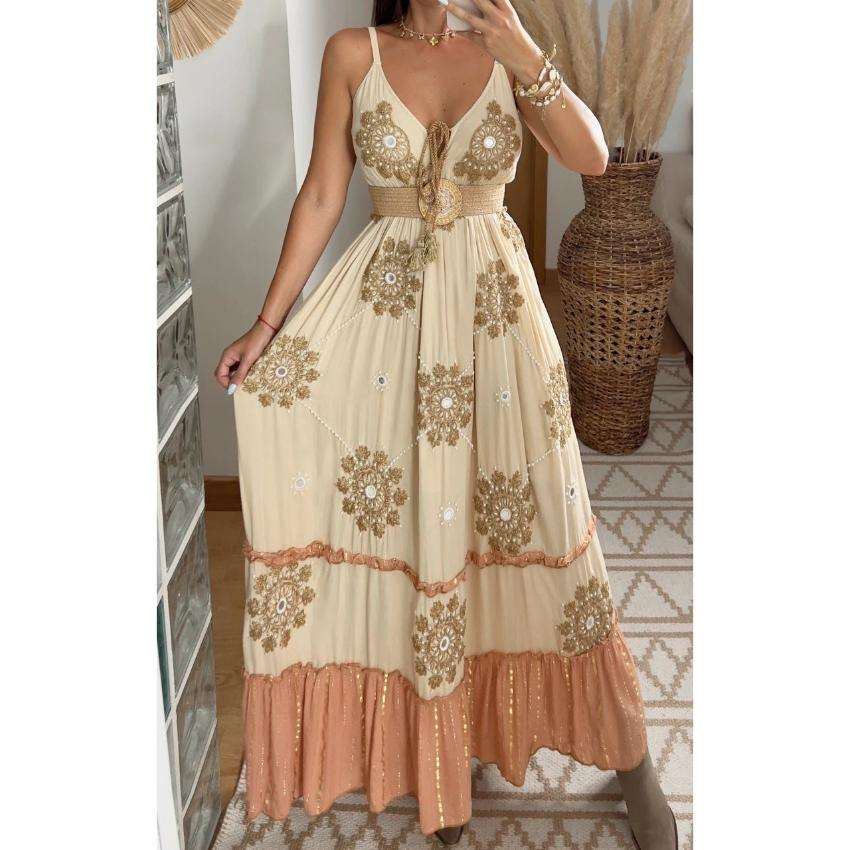 Nouvelle Robe Longue Bohème Écologique Multicolore à Imprimé Floral, Sans Manches, Col en V, Broderie Étagée, Idéale pour les Vacances à la Plage 2026