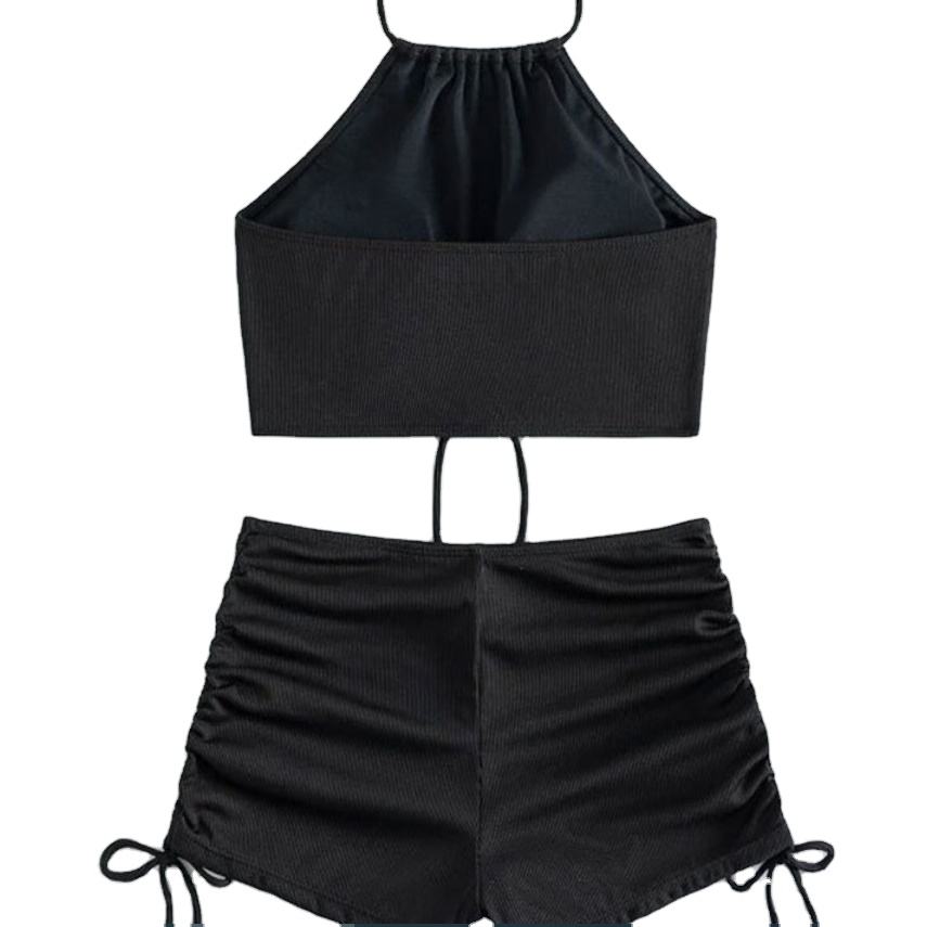 Nouveau Maillot de Bain Deux Pièces Femme Style Européen et Américain 2026, Solide, Taille Haute, Bretelles, Dos Nu, Respirant, avec Short Boxer d'Été
