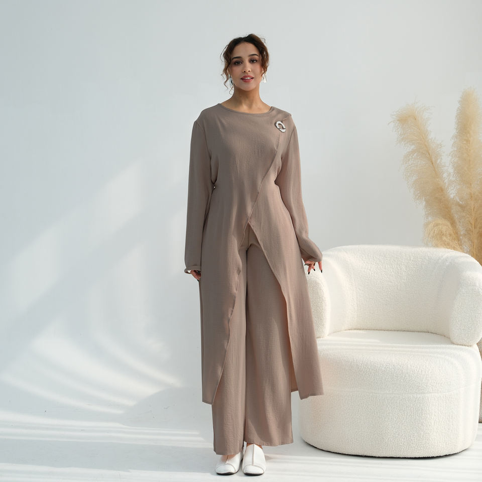Nouvel Ensemble Abaya Pantalon Turque 2 Pièces Modeste en Crêpe Doux pour Femme, Vêtements Islamiques, Haut Long et Pantalon Coordonné 2026