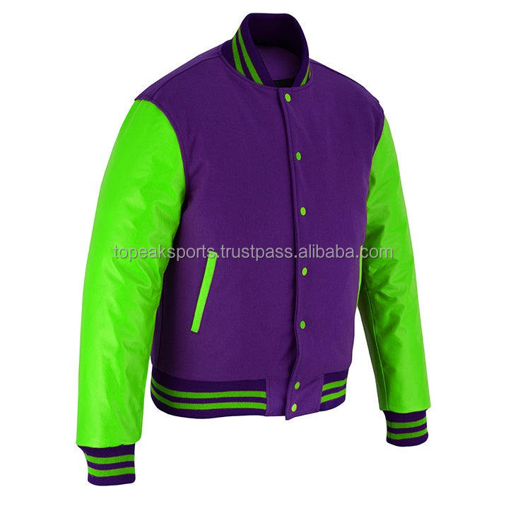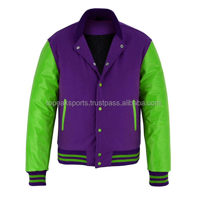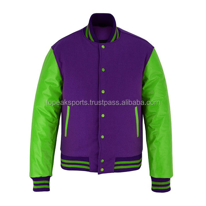 Blouson universitaire OEM 2026 en laine violette de qualité supérieure avec manches en cuir vert pour homme – 100 % haute qualité, faible MOQ, vestes chauffantes tendance