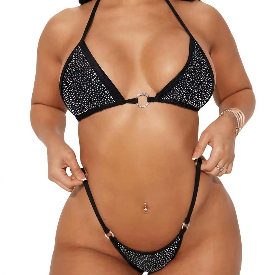 2026 Sexy Solid Color Bikini Rhinestone Jewelry Decor Tie Backless Swimwear Beach Two-Piece String Swimsuit Set for Pool Parties