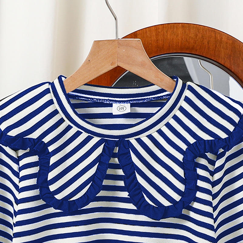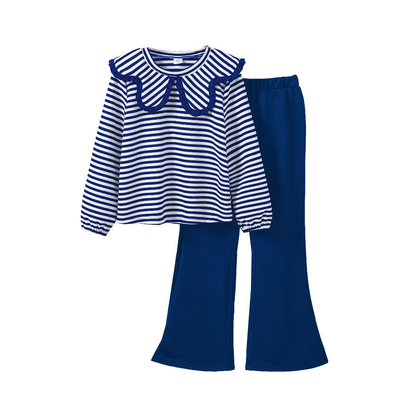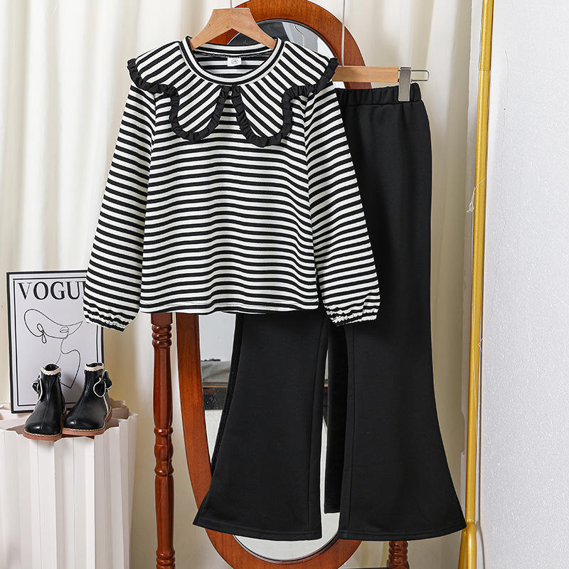 Ensembles de vêtements pour enfants pas chers printemps-automne 2026, vente en gros, haut à col volanté rayé, pantalon évasé, deux pièces, vêtements pour adolescentes