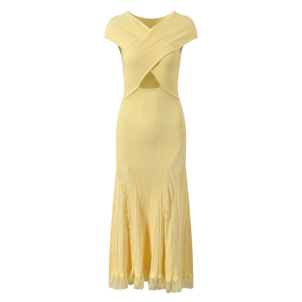 Nouvelle Collection Printemps 2026 : Robe Longue en Jean Élégante à Col Croisé, Dentelle Évidée et Patchwork, Coupe Ajustée et Fluide, Effet Amincissant