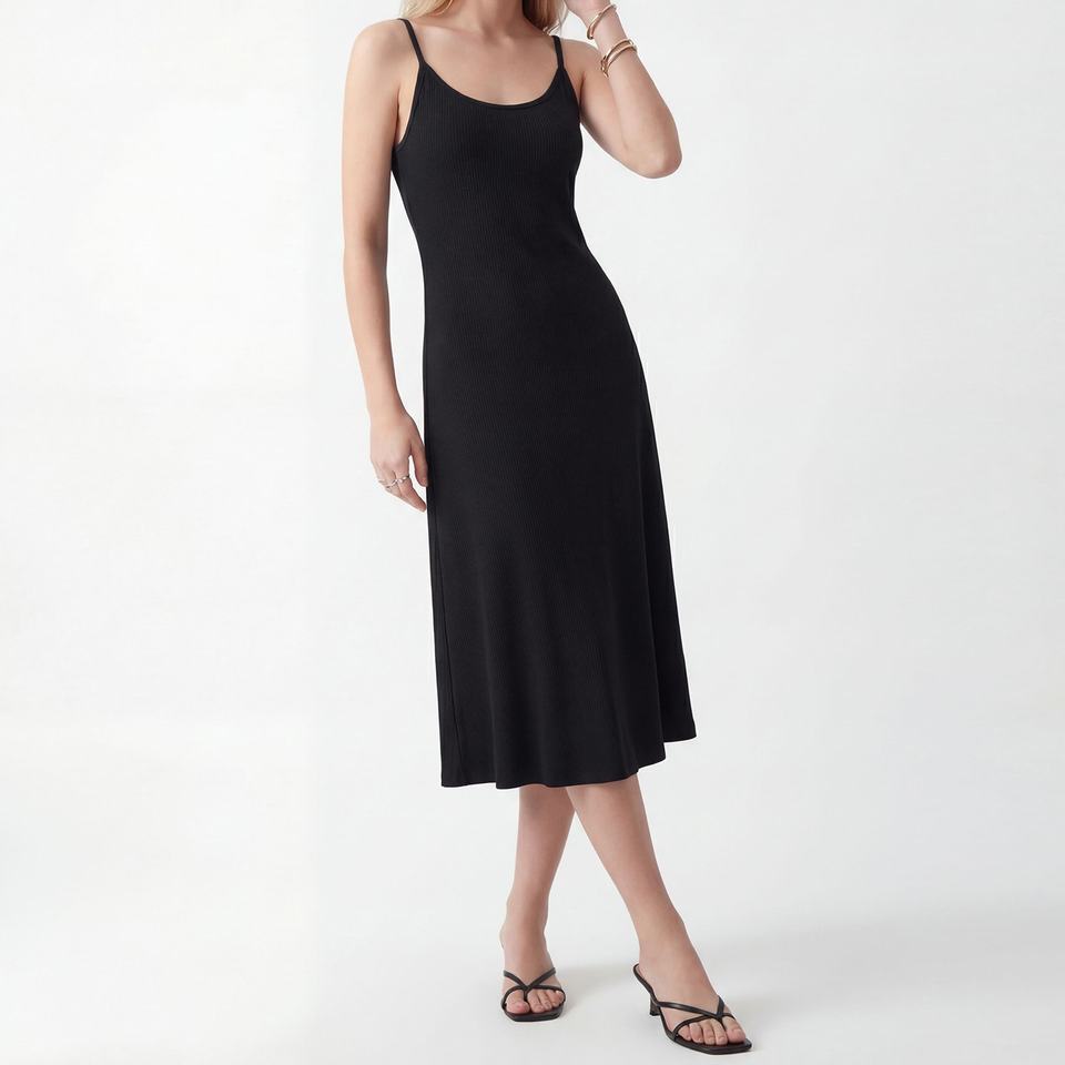 Robe noire chic sans manches taille haute coupe ajustée en maille côtelée style vintage pour femme, collection Printemps/Été 2026, idéale pour le bureau
