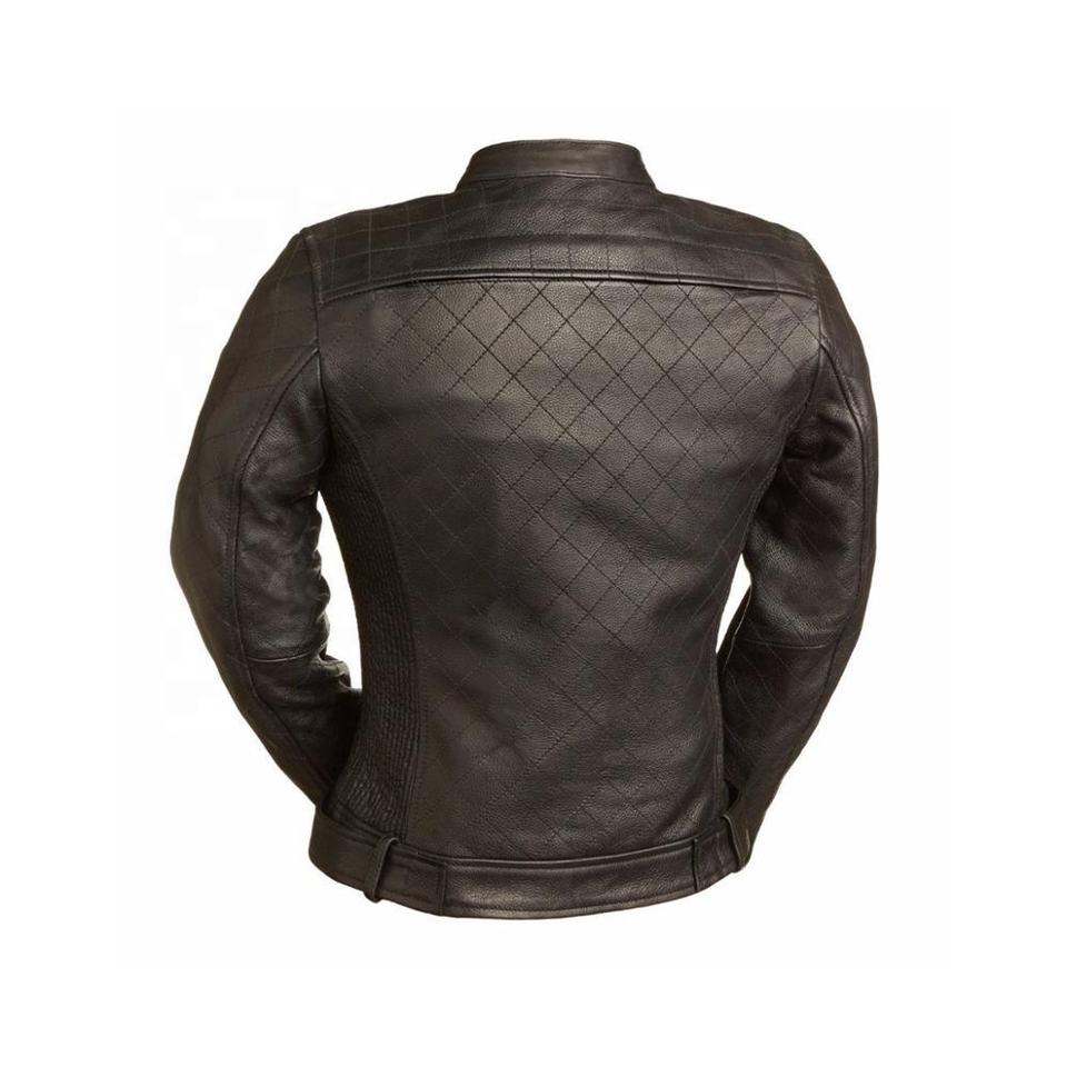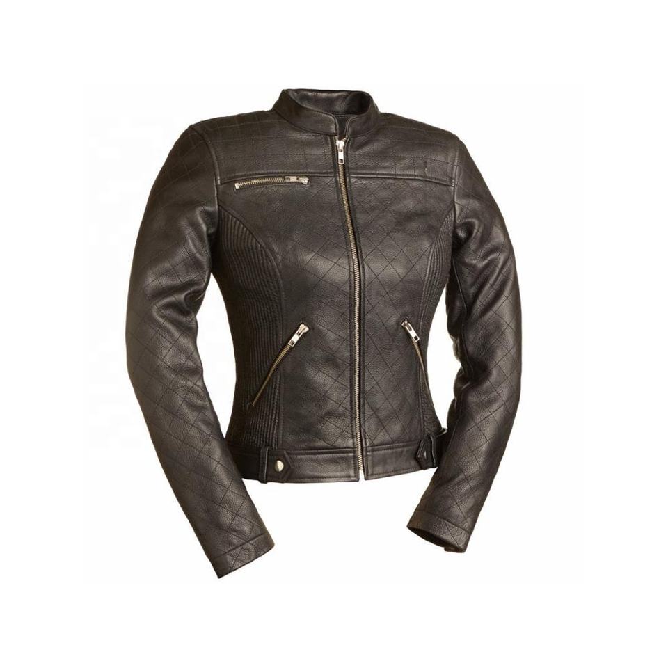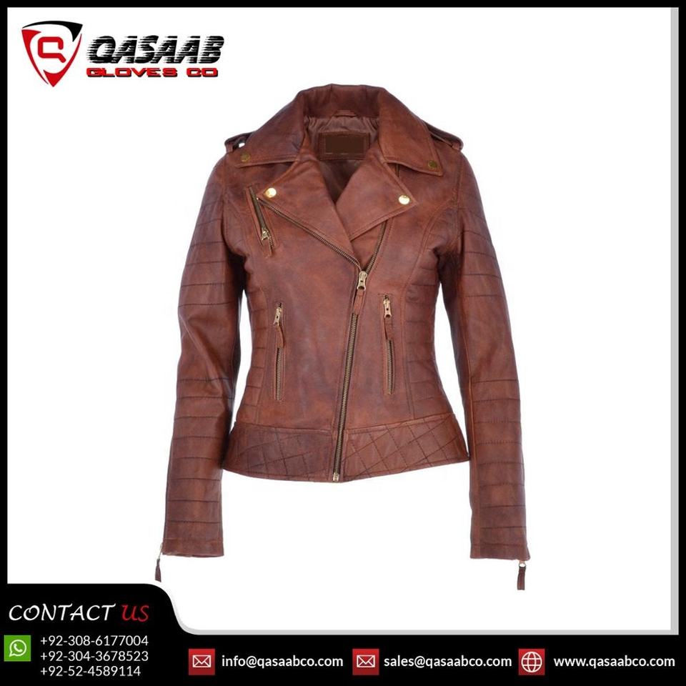 2026 Stylish-Brown Quilted-Lining High Quality Women Motorbike Fashion Genuine Leather Jacket With Zip-Front