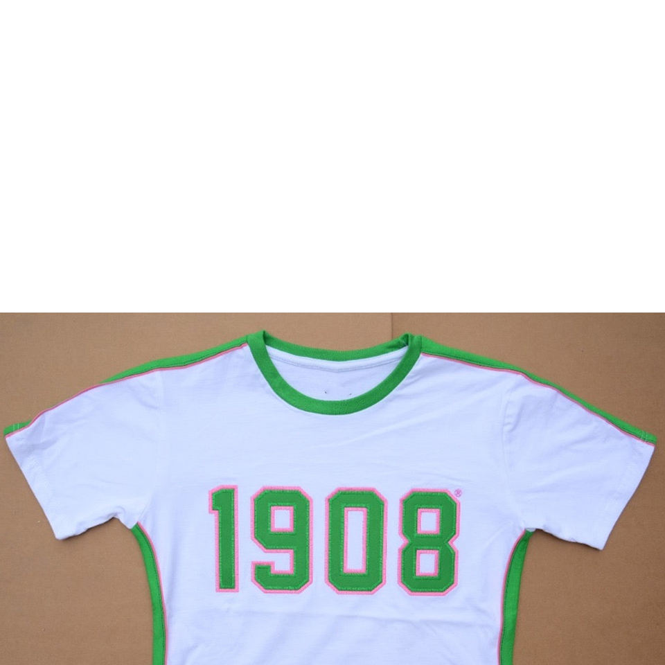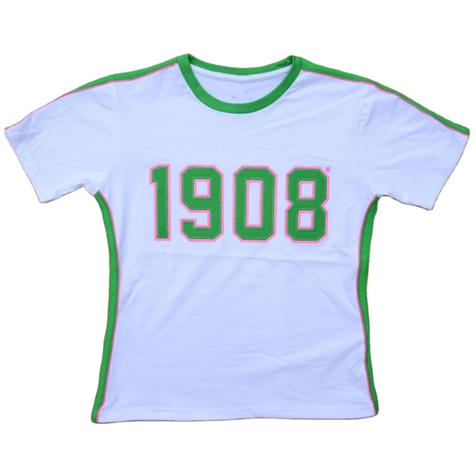 T-shirt ALPHA PHI ALPHA 1908 Été 2026, col rond grec avec logo brodé en chenille personnalisé, blanc et vert