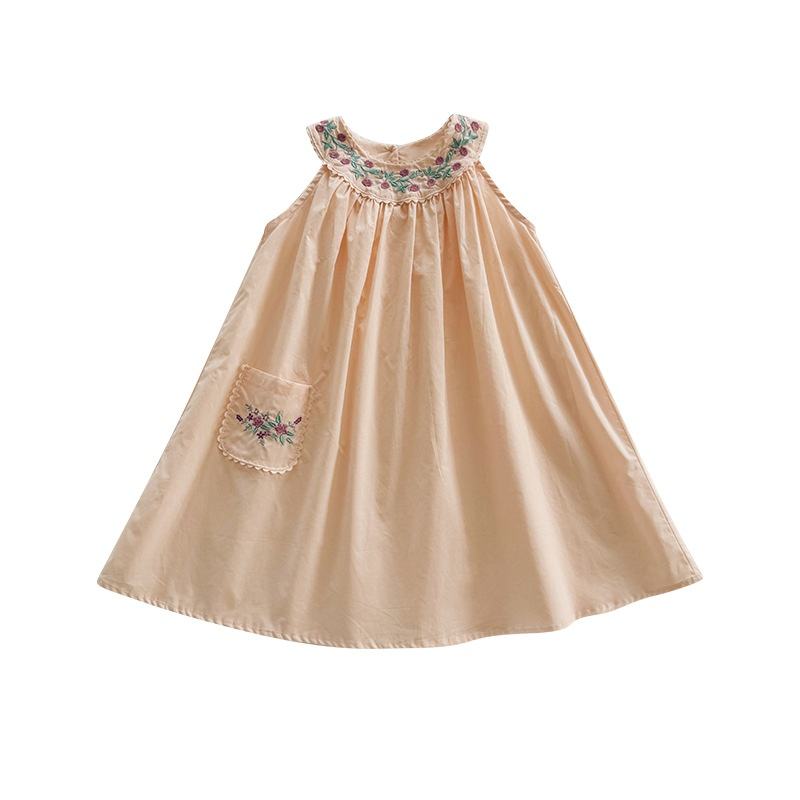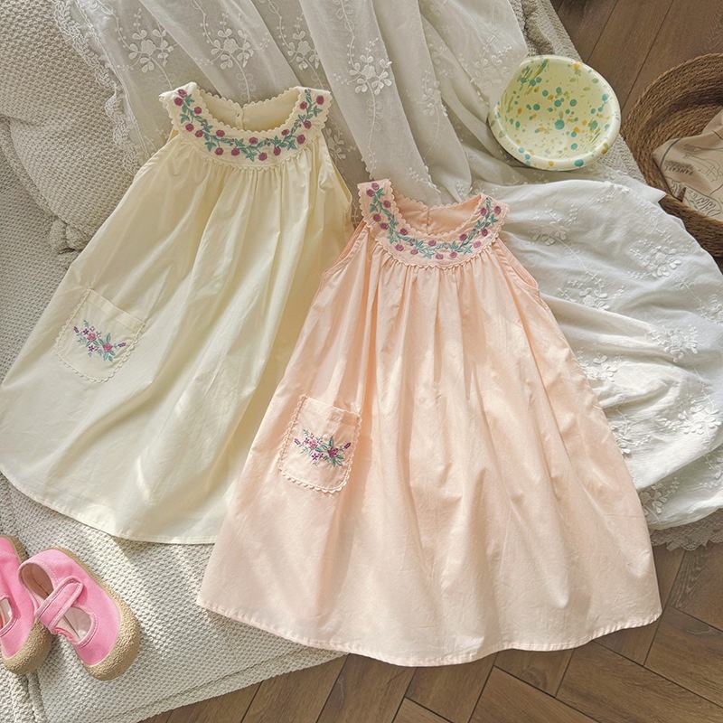 Collection Été 2026 : Robe Princesse Fille sans Manches et Dos Nu en Coton Brodé à la Française, Coupe Trapèze