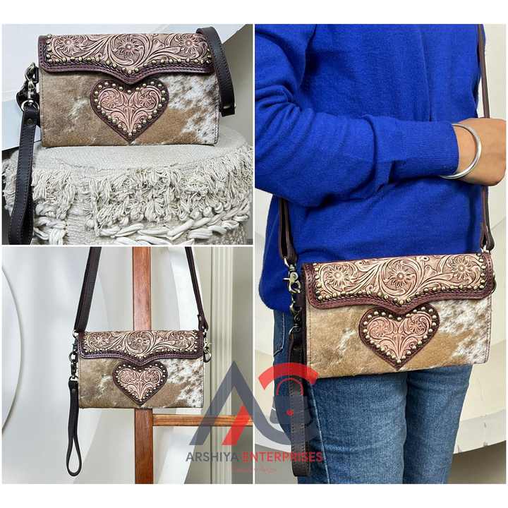 Sac à bandoulière en cuir de vachette fait main, style western, avec motif cœur, mini sac à main tendance 2026 pour femme