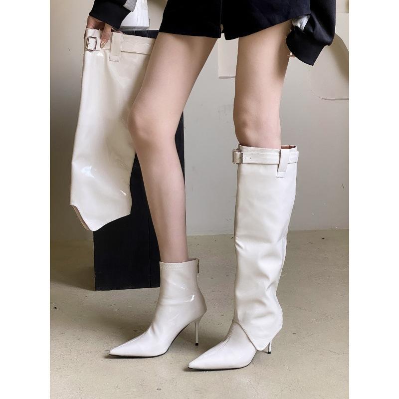 Bottes hautes en cuir verni à talon aiguille et bout pointu pour femme 2026, avec bride à boucle, style bottes de chevalier sous le genou