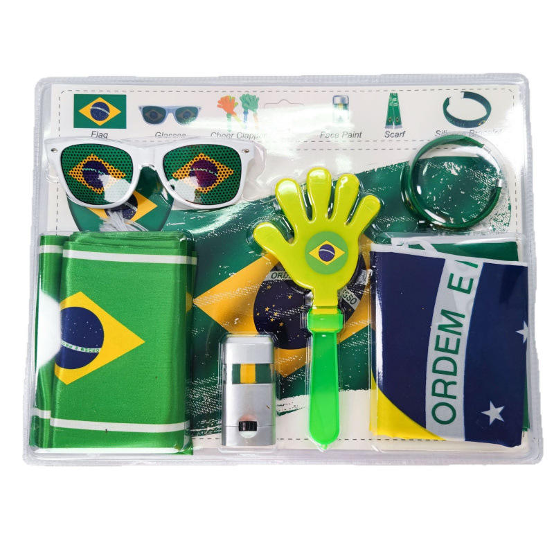 Drapeau, lunettes, claquemette, peinture pour le visage, écharpe, bracelet en silicone