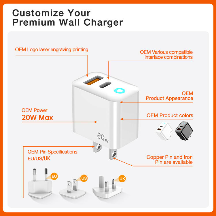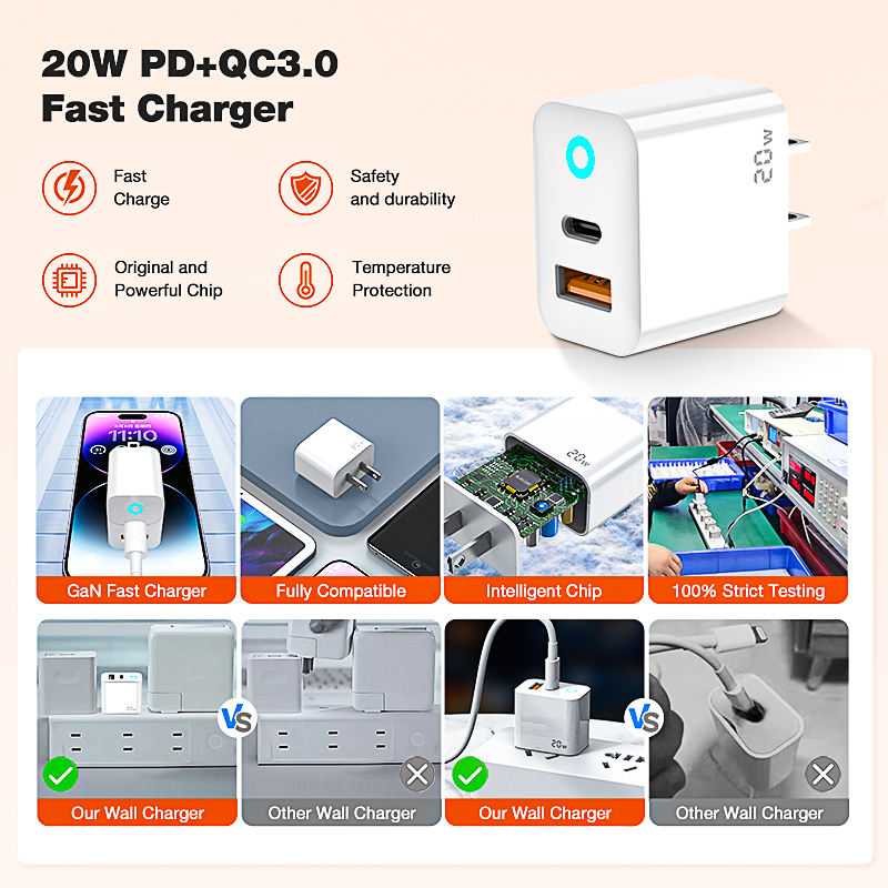 Chargeur mural rapide 20W PD QC3.0 double USB C pour iPhone 14 13 12 11 Pro Max GAN SCP OTP EU US Plug Type C Sortie 5V/3A