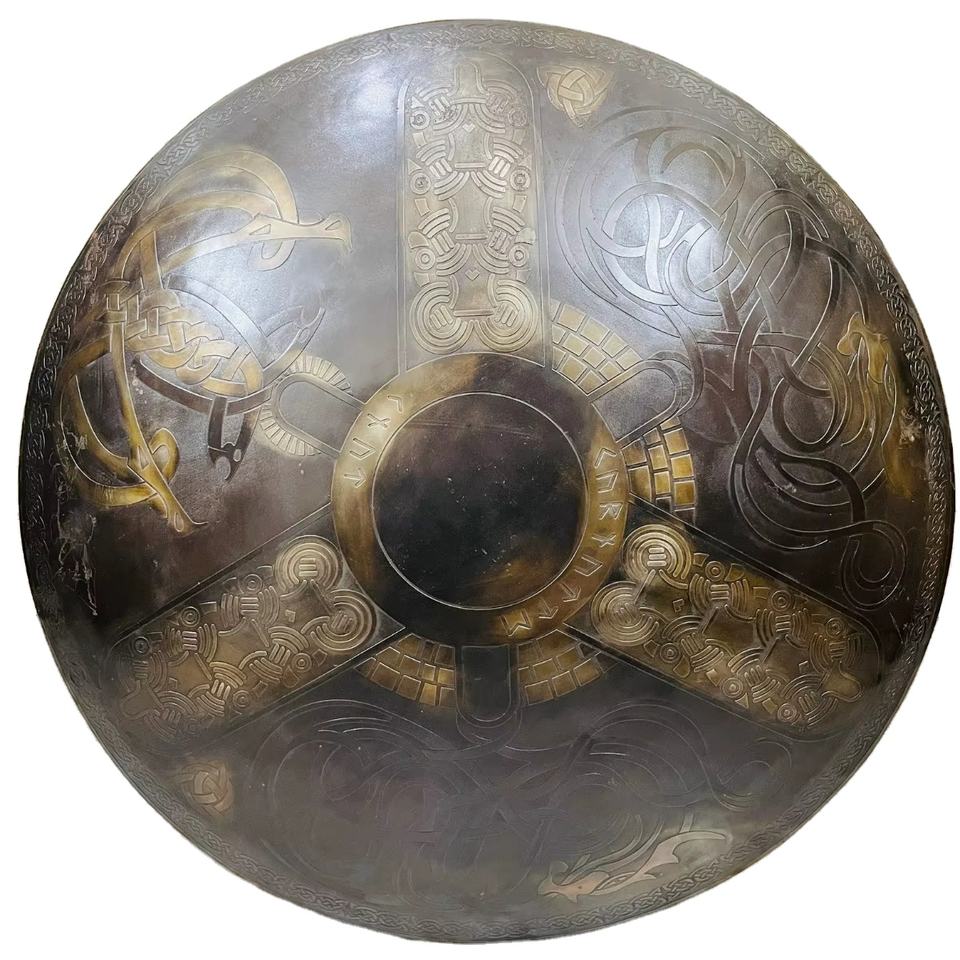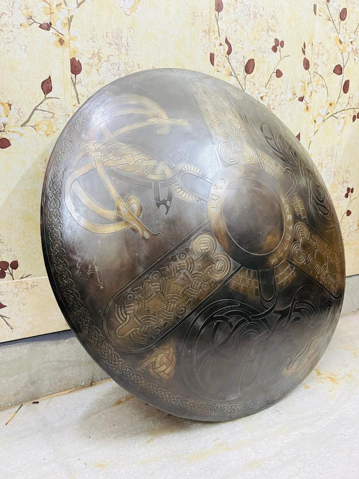 Bouclier décoratif médiéval de 22 pouces, finition marron et dorée | Bouclier mural en acier gravé | Bouclier de présentation de style guerrier antique et viking