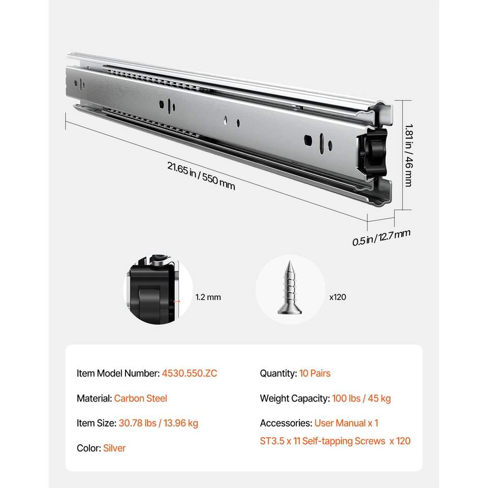Glissières de tiroir à roulement à billes à extension complète de 22 pouces, 10 paires, capacité de charge de 100 lb, rails robustes à montage latéral pour commodes et armoires