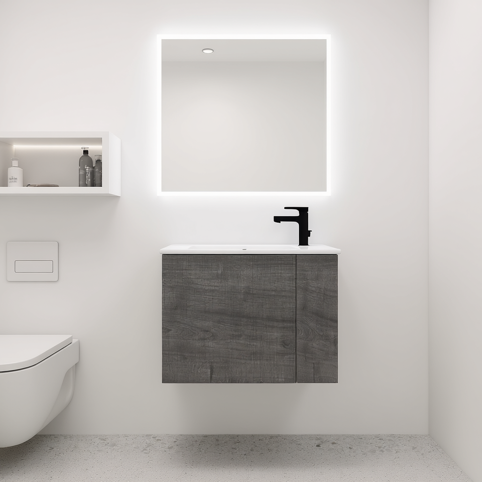 Bathroom Vanity Sink 22x13 Wall Mounted Modern Minimalist Design Grey Imitative Oak MDF Ceramic Basin Soft Close Door
