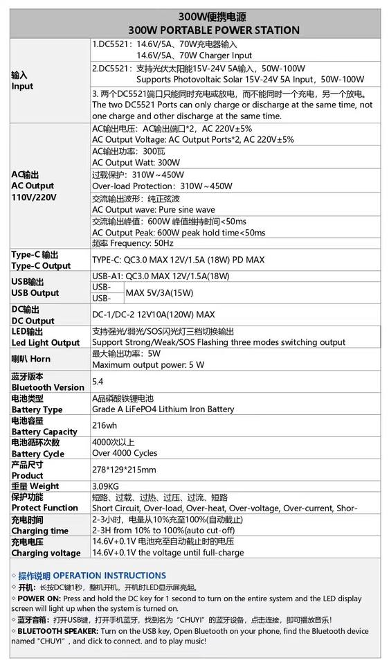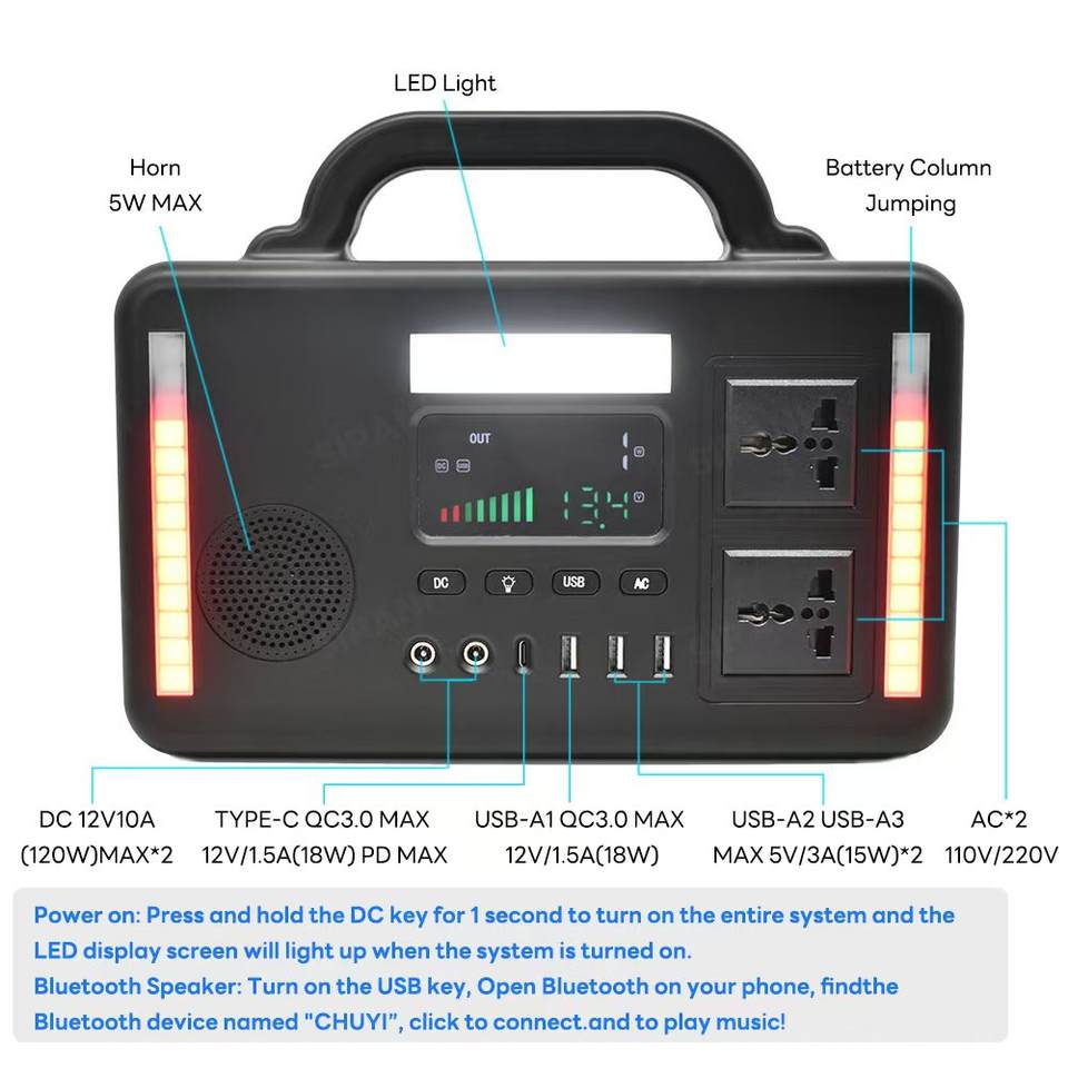 Station d'alimentation portable 220V 300W, panneau solaire MPPT, batterie LiFePO4, adaptateur secteur pour voiture, charge sans fil, haut-parleur Bluetooth pour le camping