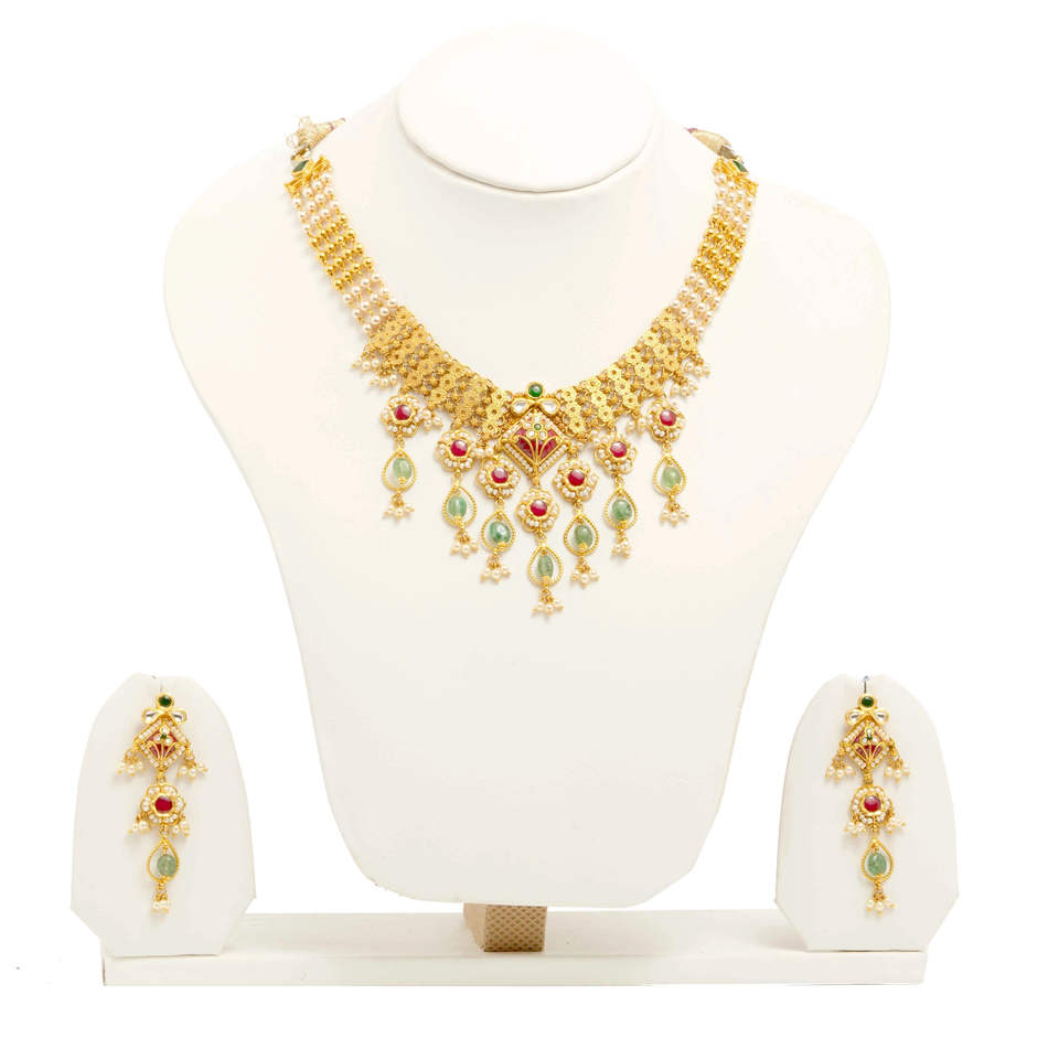 Collier traditionnel en or pur 22K serti de boucles d'oreilles bijoux de mariée indiens fabriqués à la main avec bijoux en or fin rouge et vert
