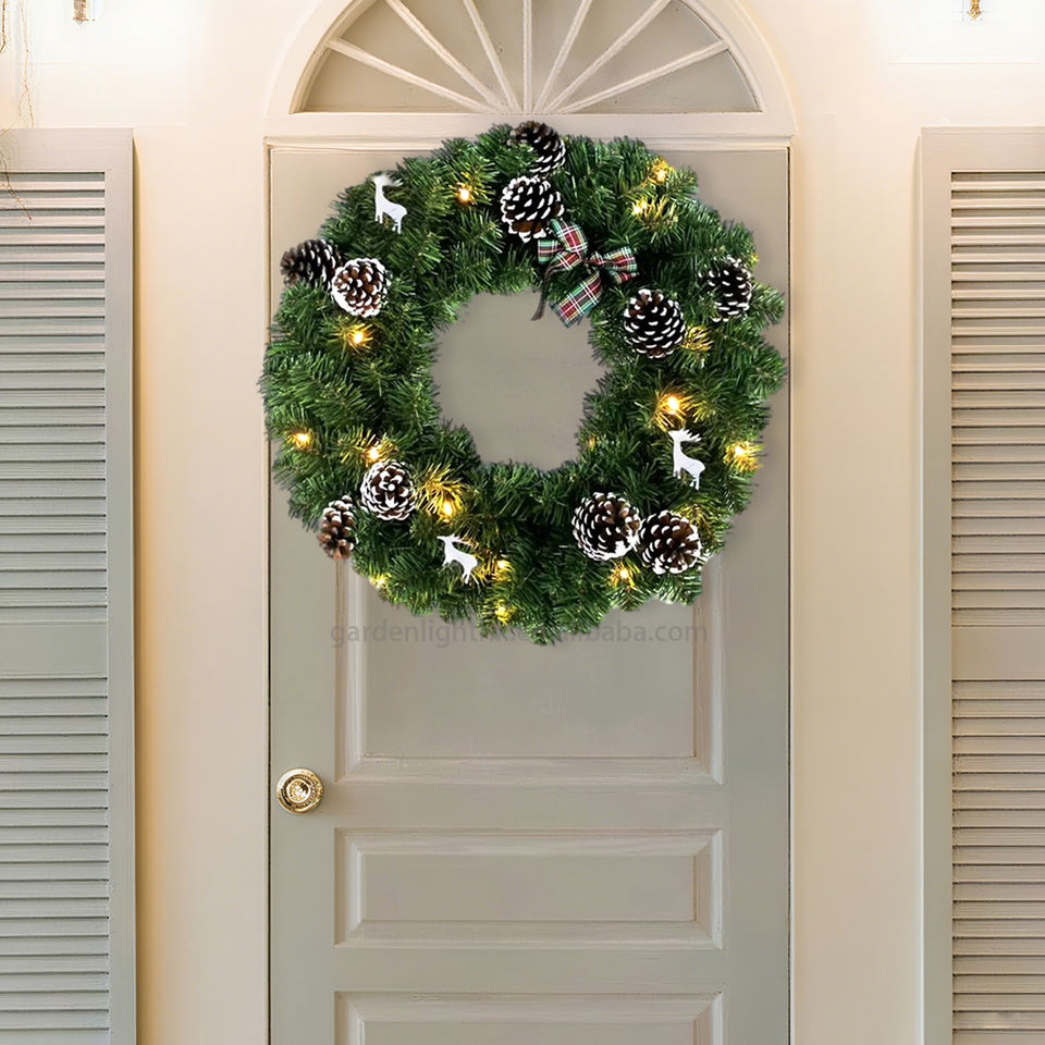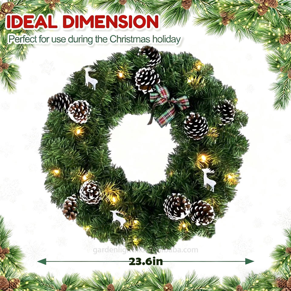 Nom du produit:Couronne de Noël de 23,6 pouces avec cerf blanc, pommes de pin et ornements d'arc