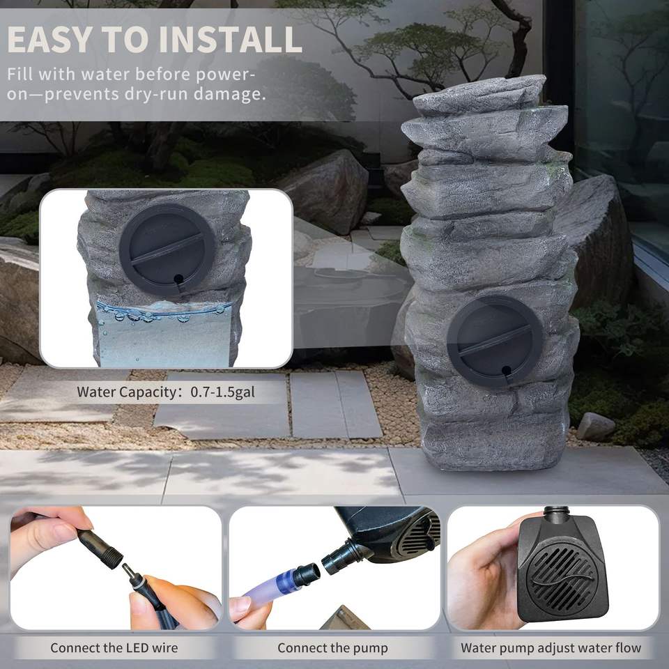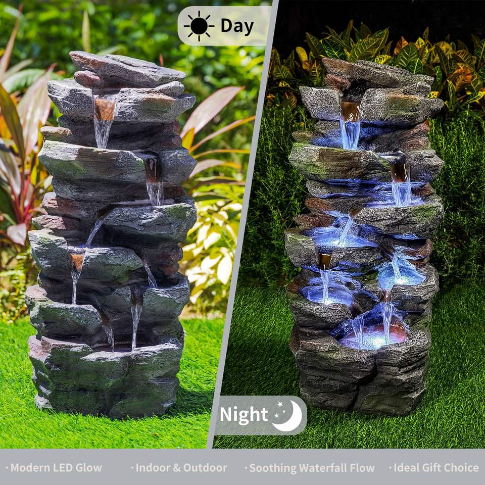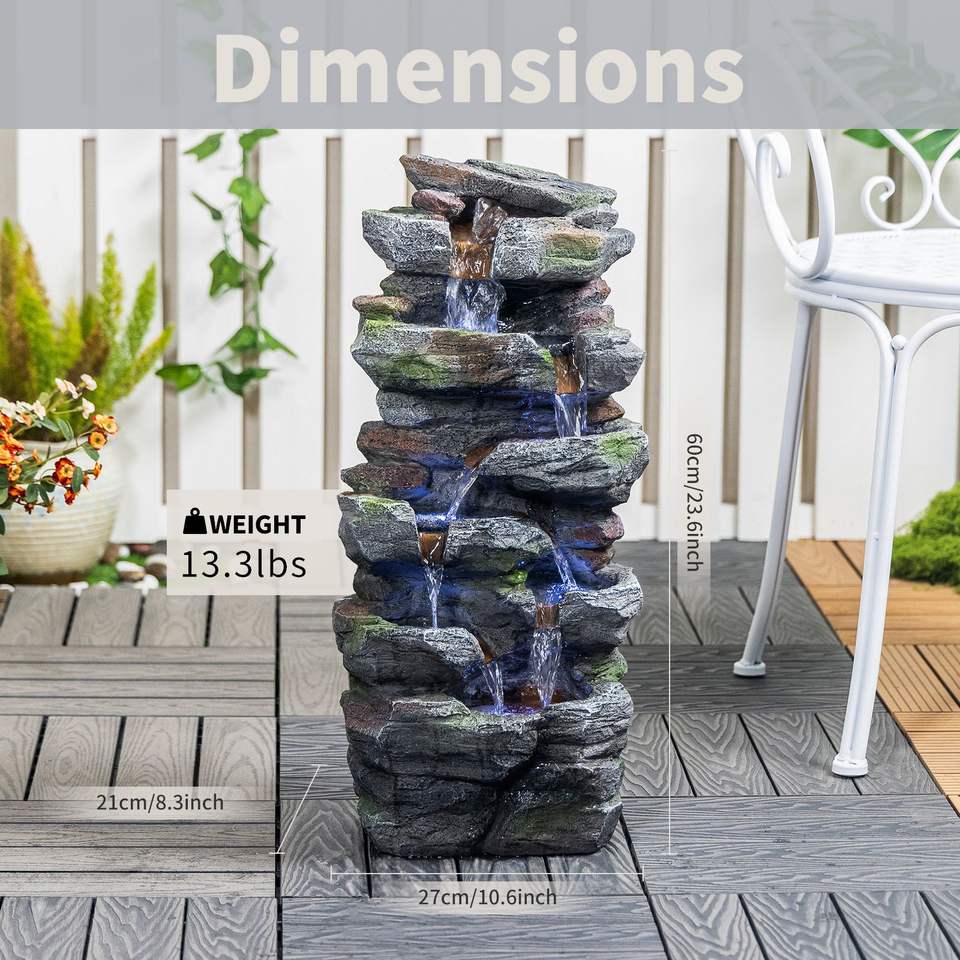 Fontaine de jardin en pierre cascadeuse de 23 pouces avec lumières LED pour patio, pelouse et jardin extérieur