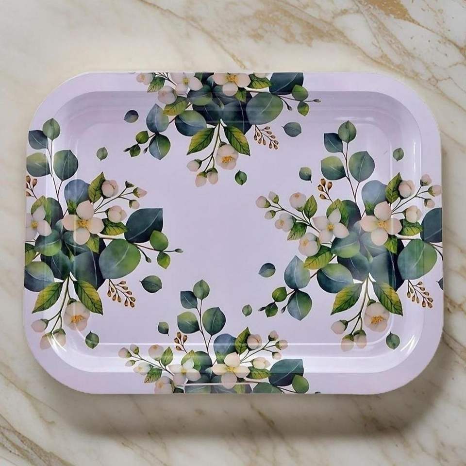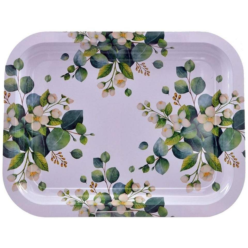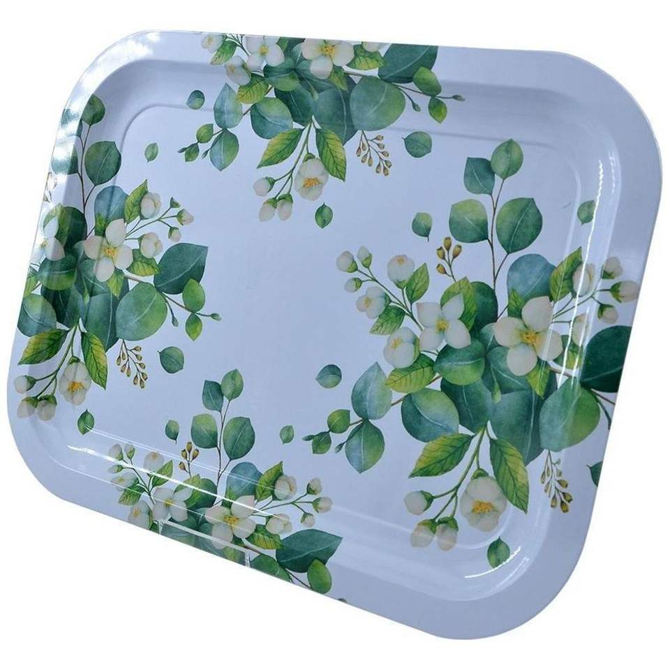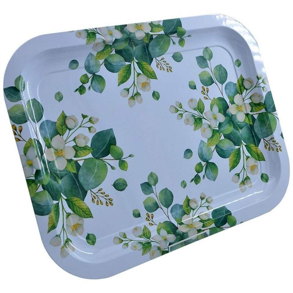 Plateau de service décoratif en bois Kontensan EF161T3 233x307mm, design feuille verte et fleur blanche en résine nacre et rotin, motif émeraude