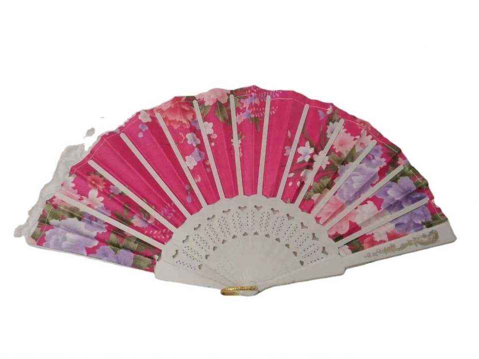 Éventail en plastique blanc de 23 cm, multi-imprimé, en tissu satiné, avec dentelle multicolore, idéal pour les fêtes, les promotions, le Nouvel An et Pâques