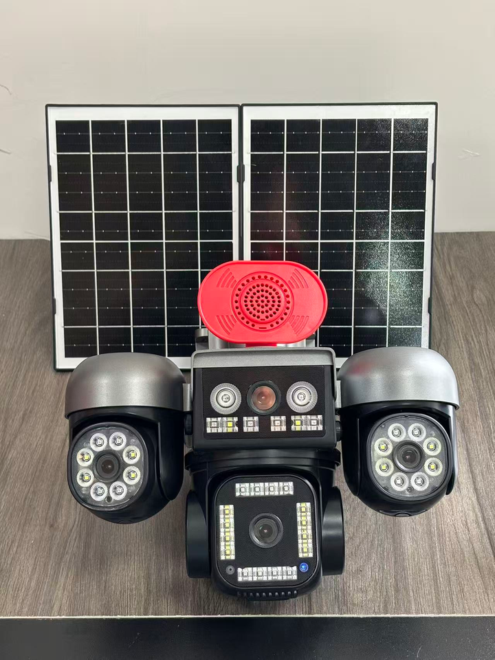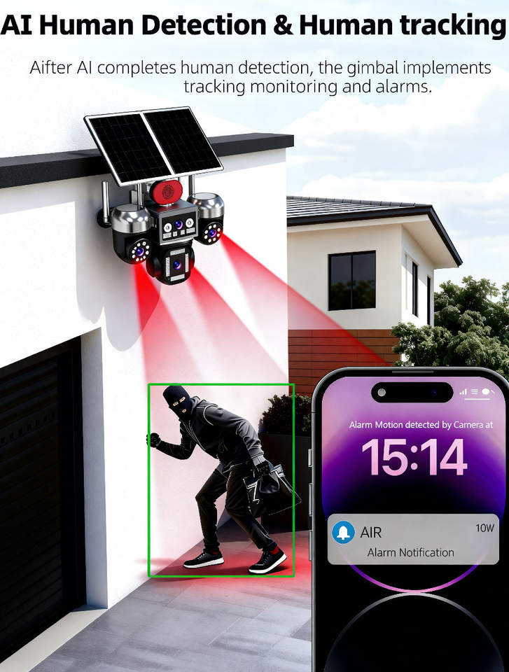 Caméra solaire 8MP AOV 24h/24 avec quatre objectifs, couleur intégrale 8K, sécurité sans fil CCTV, carte SIM 4G, deux panneaux solaires extérieurs