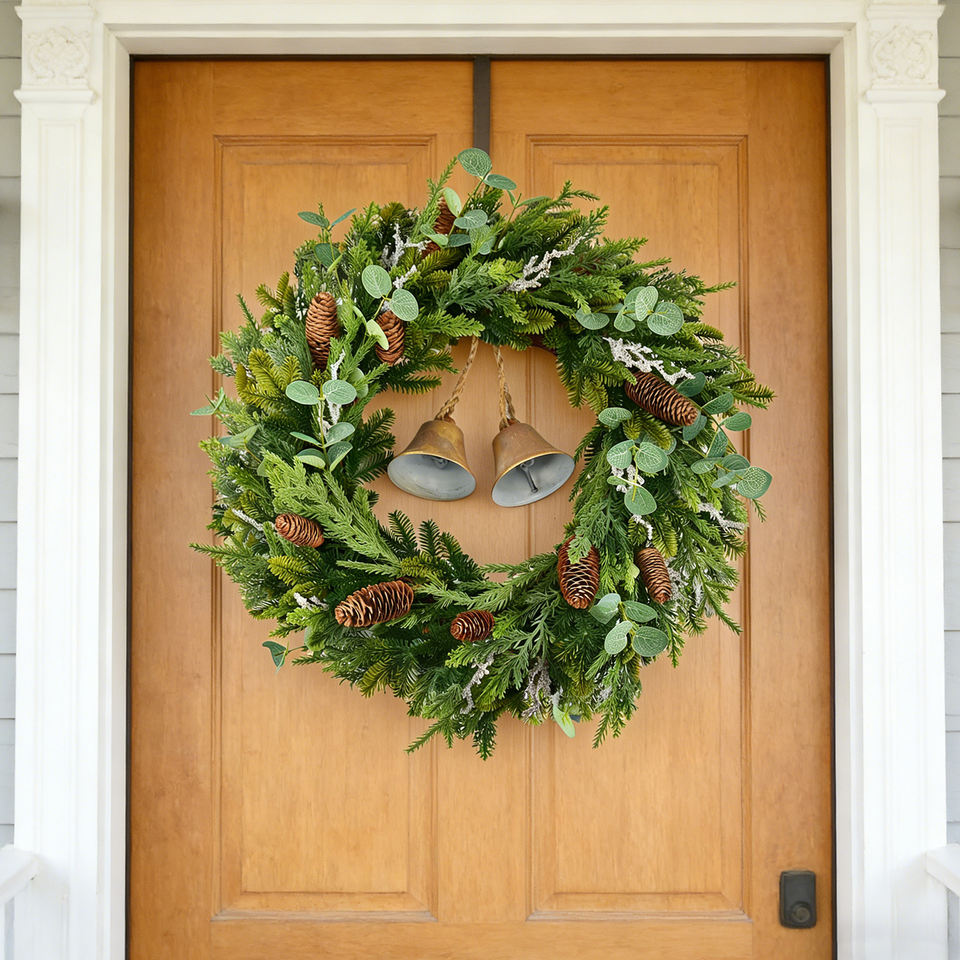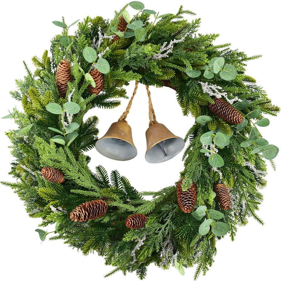 Pommes de pin artificielles mélangées, feuilles d'eucalyptus, clochettes en métal