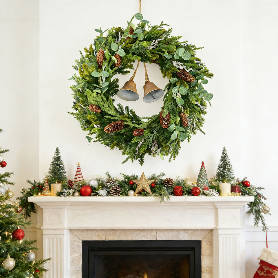 Couronne de Noël de 24 pouces (60 cm) avec des cônes de pin et des clochettes, couronne artificielle en feuilles persistantes pour porte d'entrée