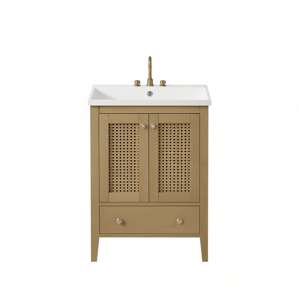 Meuble de salle de bain 24 pouces avec cadre solide, vasque en céramique, armoire en rotin, deux portes, tiroir, finition naturelle, sur pied