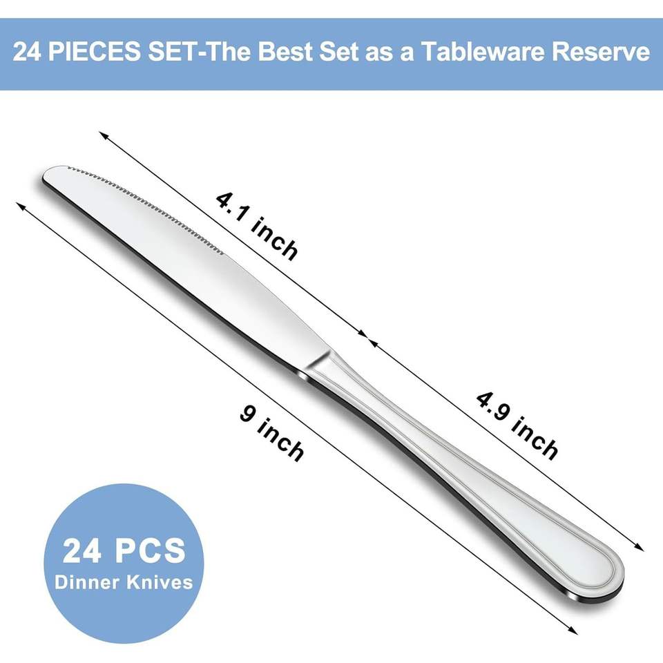 Ensemble de 24 couteaux à dîner affûtés avec manche élégant, en acier inoxydable de qualité alimentaire, comprenant un couteau à beurre