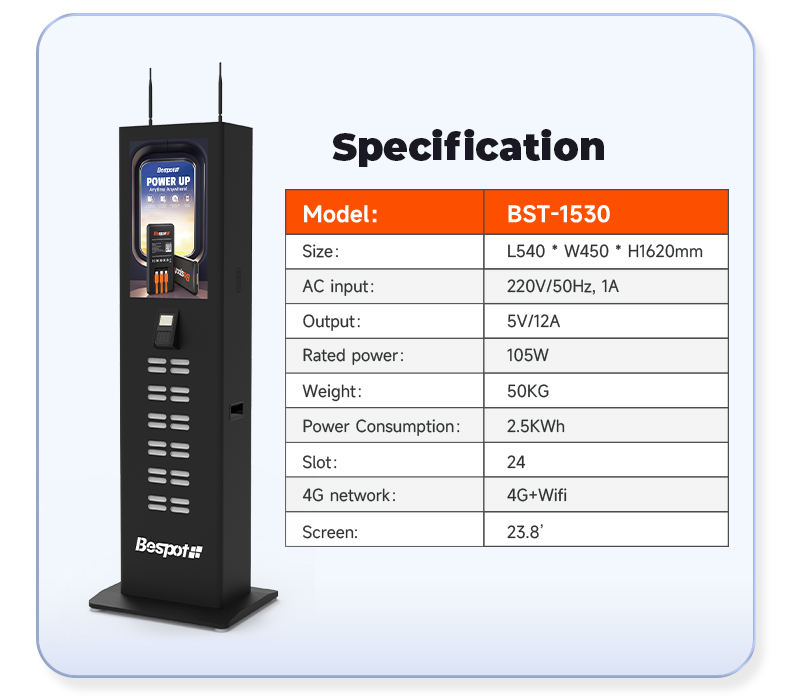 Borne de recharge pour distributeur automatique 24 ports avec système de paiement par carte POS et affichage publicitaire commercial