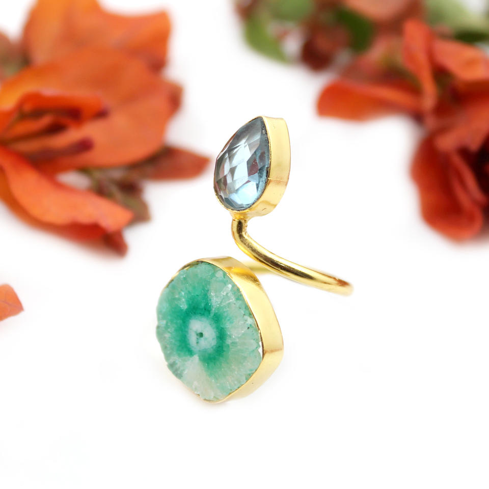24K Plaqué Or Naturel Solaire Quartz Cristal Quartz Double Gemme Poire Forme Designer Femmes Anneau Bijoux En Gros Inde
