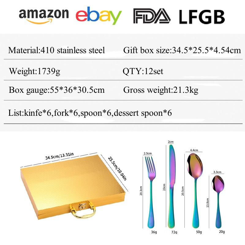 24PCS Pas Cher En Acier Inoxydable Cuillère Fourchette Couteau Couverts Boîte Dorée Solige Miroir De Haute Qualité Ensemble Complet de Couverts pour Restaurants