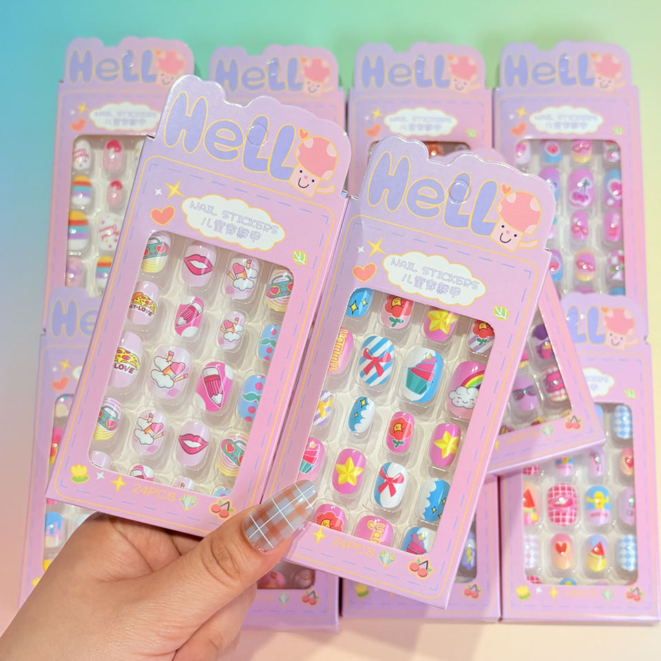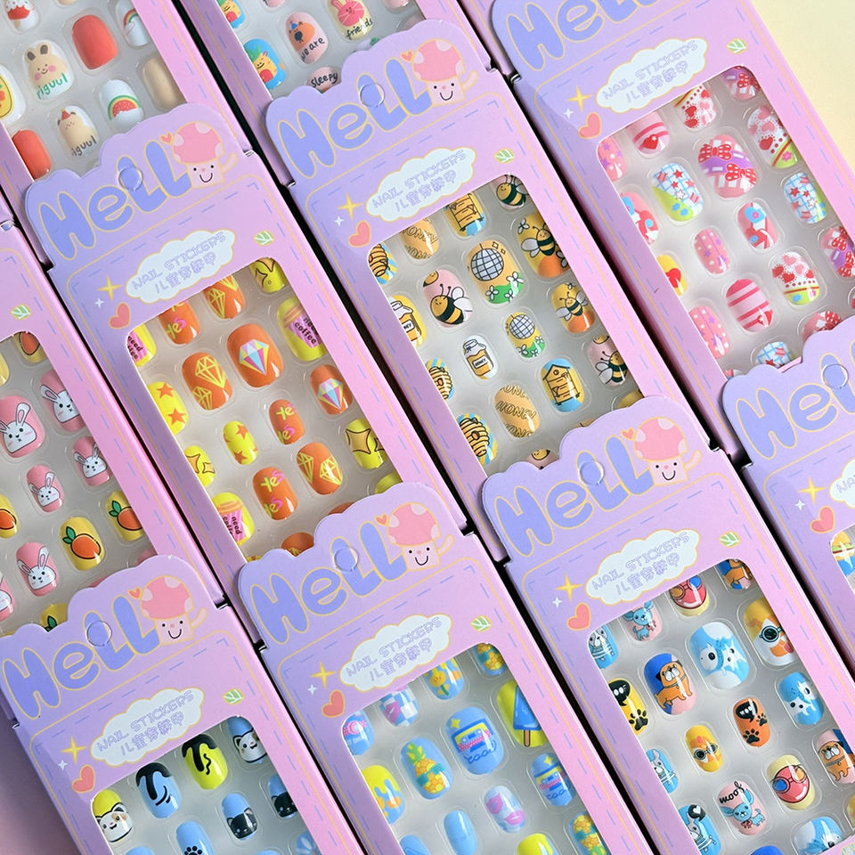 24 faux ongles pour enfants, motifs de dessins animés, adorables, pour filles, patchs d'ongles artificiels en acrylique, à presser, style Kawaii