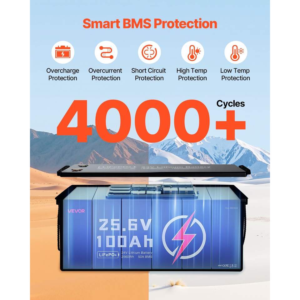 Batterie au lithium LiFePO4 24V 100Ah à décharge profonde pour camping-car, moteurs de pêche à la traîne, marine, avec BMS 50A intégré, protection contre les basses températures, 4000+ cycles