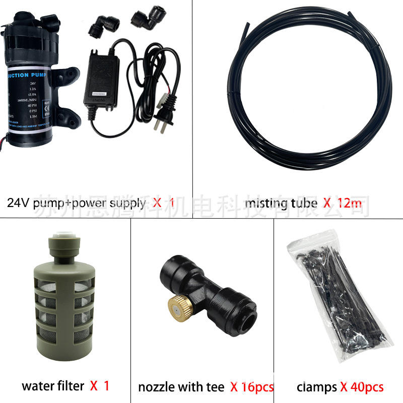 Système de brumisation silencieux 24V 6M avec filtre, buses et pinces pour le refroidissement, l'humidification et l'irrigation des jardins