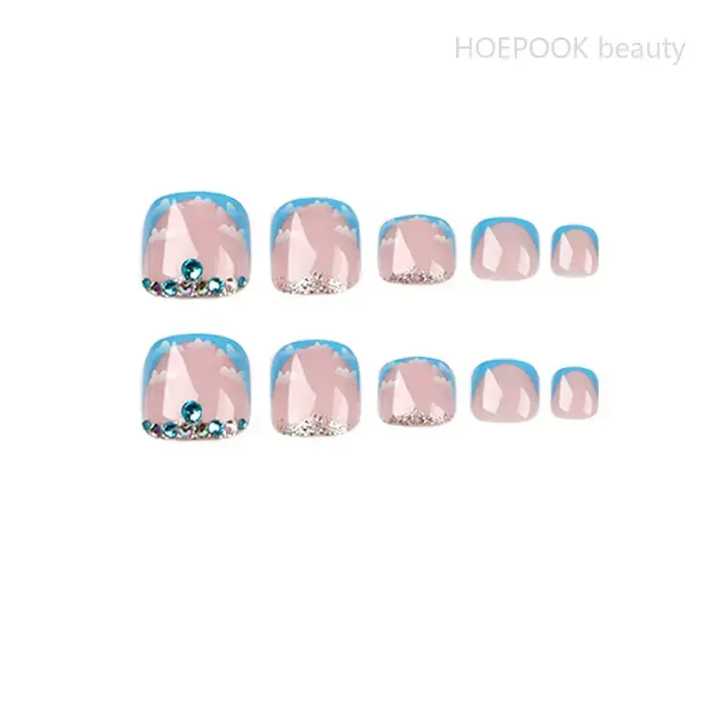 24 faux ongles de pieds bleus français en strass, sans couture, amovibles, à presser