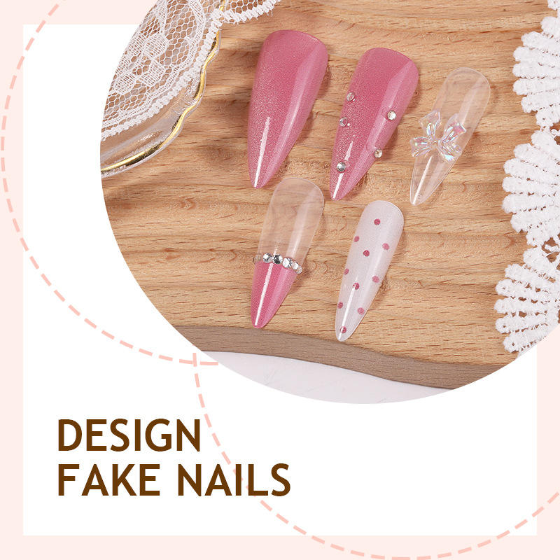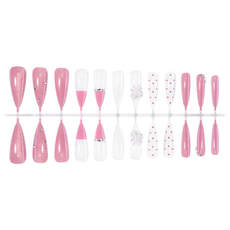 24 faux ongles roses en amande à motif pois français avec strass, en ABS de haute qualité, à presser, réutilisables pour application sur les doigts