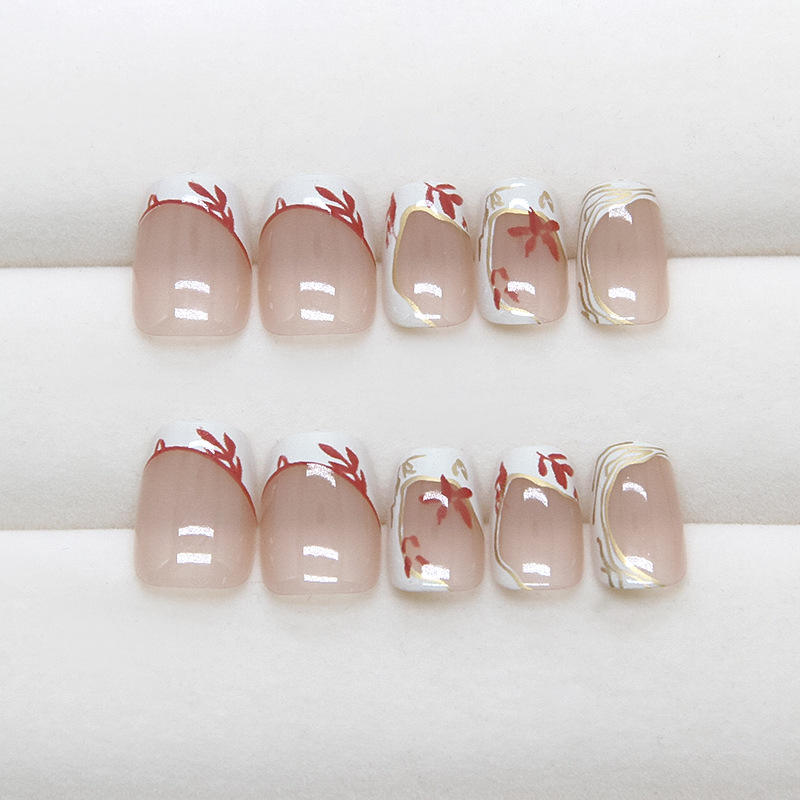 24pcs Nude Pink ABS French Press Nail Tips Square Sweet-Cool Design with Leaf Gold Glitter False Nails
