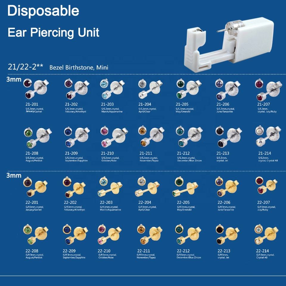 24 pièces/boîte – Kit de perçage d'oreille jetable stérilisé en acier inoxydable plaqué or 24 carats avec pierres de naissance de 10 mm – Clous d'oreilles avec pierres précieuses