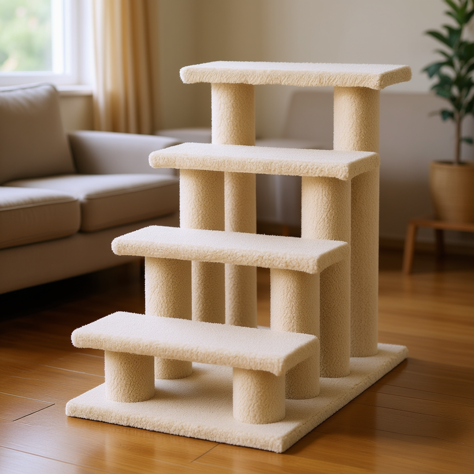 Escalier pour animaux de compagnie à 4 marches, beige, moquetté, en panneaux de particules durables, rampe pour chat, griffoir, accessoire pour animaux de compagnie
