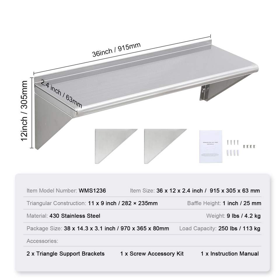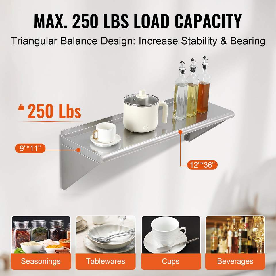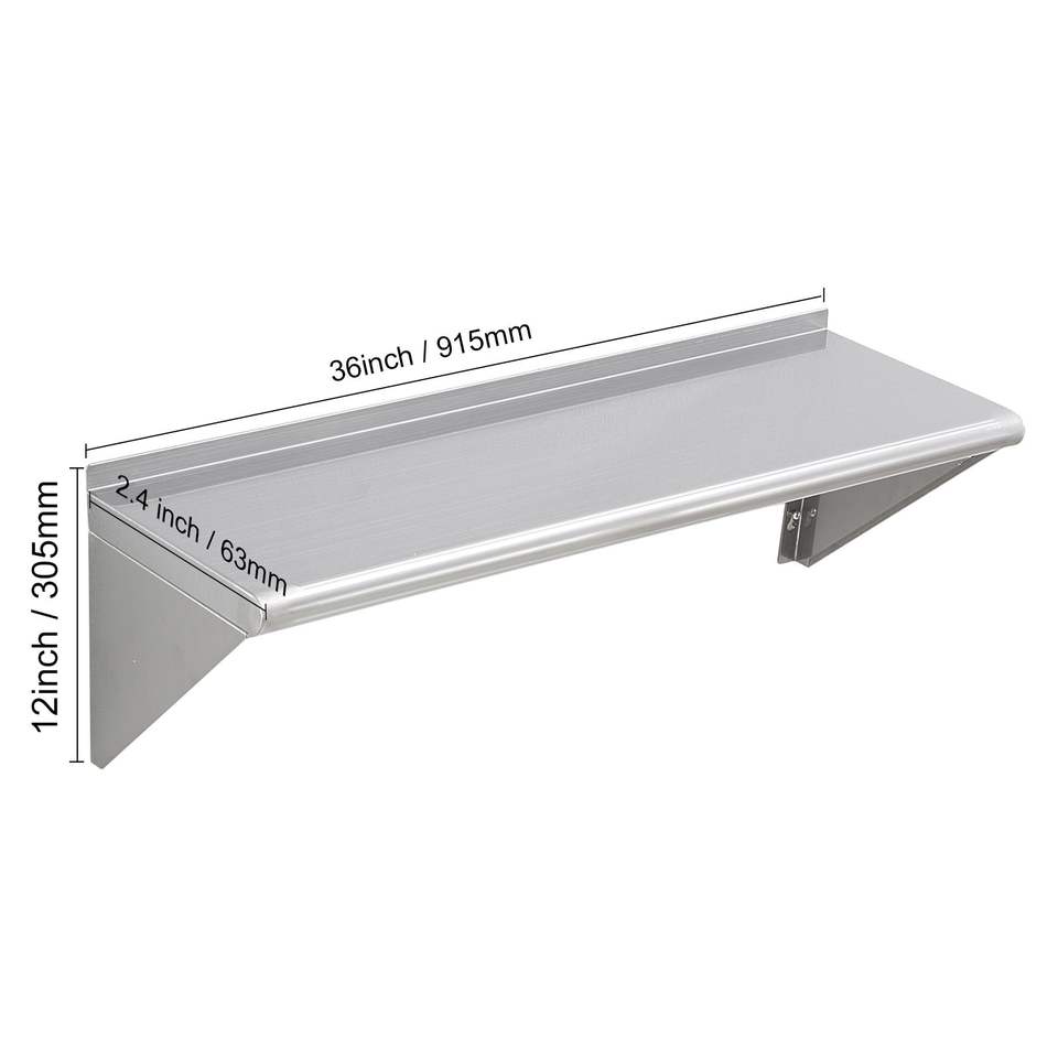 Étagères flottantes murales en acier inoxydable de 12 po x 36 po, capacité de charge de 250 lb, robustes, pour usage commercial